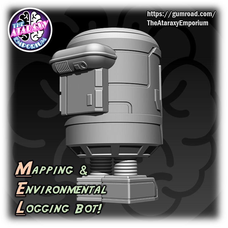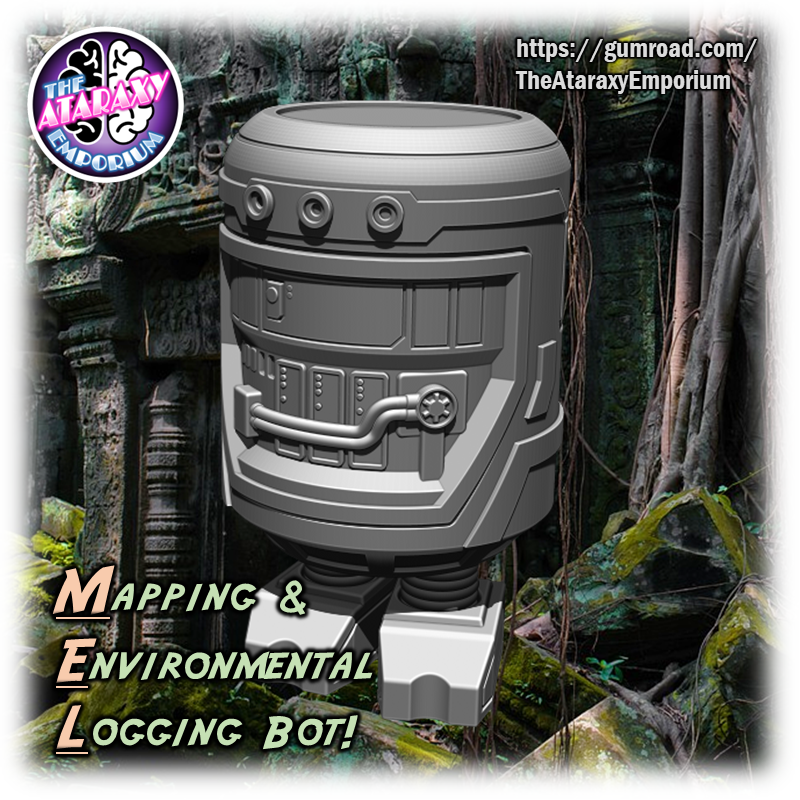 Are you treasure hunting in a galaxy far-far away? Then you absolutely need a Mapping & Environmental Logging Bot! This little data logger will follow you along on your adventure and ensure that you don't get lost in that labyrinthine alien complex! Or at the very least the little garbage pail with legs will be great blaster-cannon fodder for any giant technology-hating mechanical beasts that you may have inadvertently awakened by your ambitious absconding with ancient antiquities!