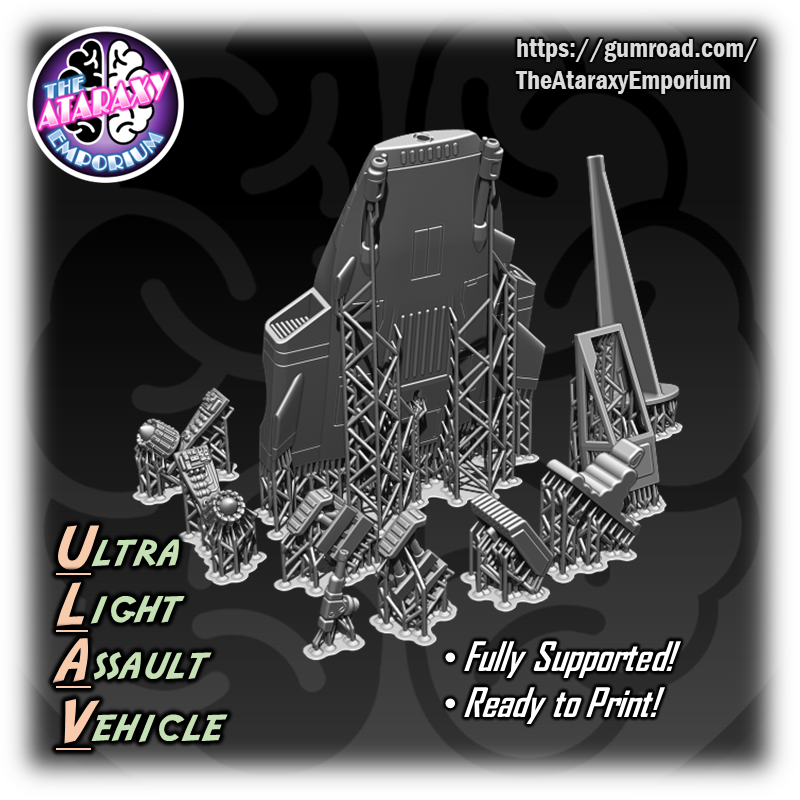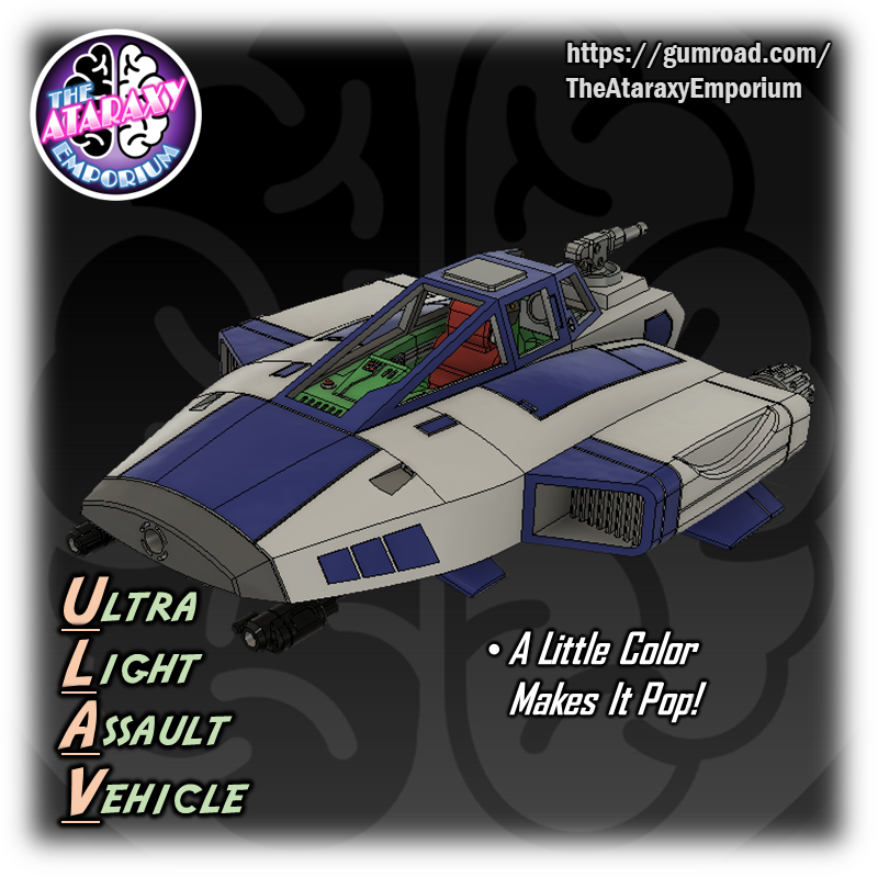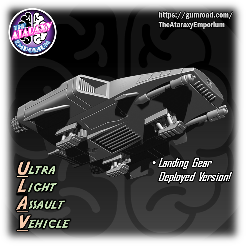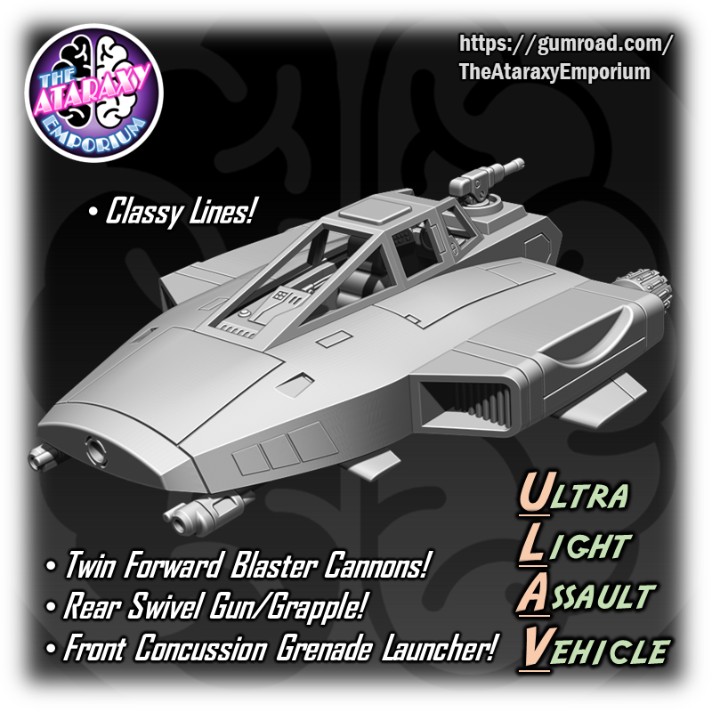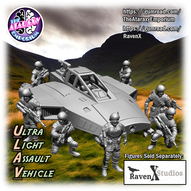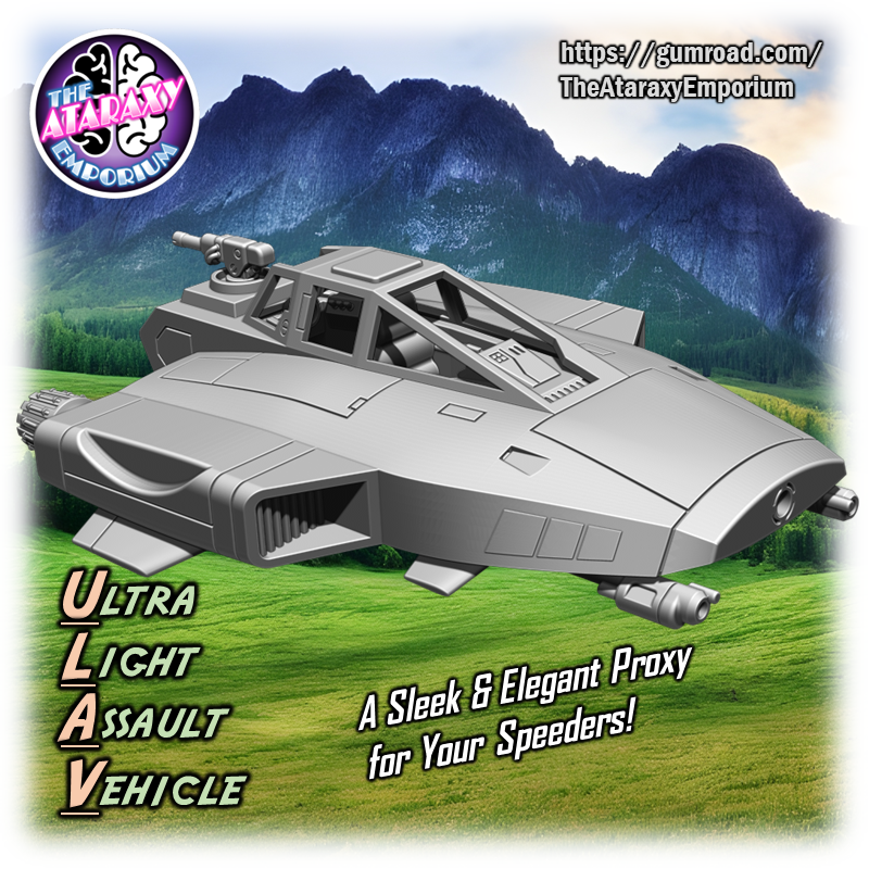 An elegant weapon for a more civilized age! The Ultra Light Assault Vehicle (ULAV) is a perfect proxy for your speeders. This model can be mounted on a flight stand or printed out with landing gear for filling out your airbase hangers and landing pads! Pair this speeder with RavenXStudios Kota Militia Rebel Commando Bundle for an awesome rebel combat team! (sold separately here: https://ravenx.gumroad.com/l/weowhb)